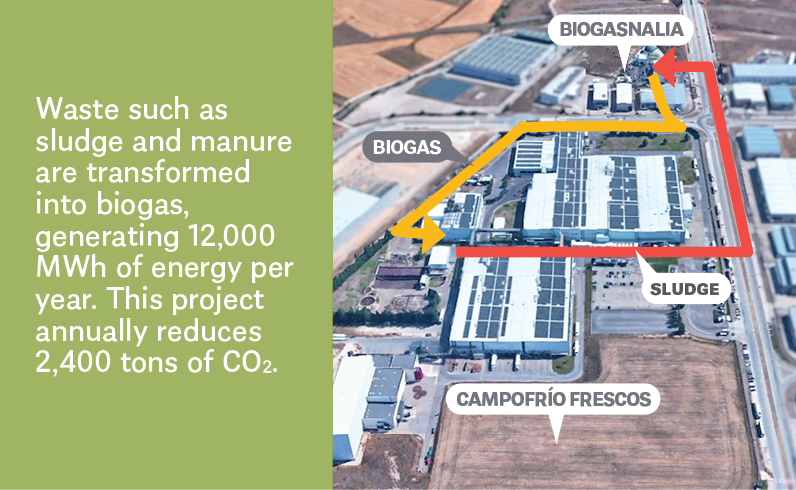 This process resulted in the production of 12,000 MWh of energy per year, which represents the migration of 40% of natural gas consumption to biogas and a reduction of 2,100 tons of CO2 emissions annually. Campofrío Frescos uses biogas to generate thermal energy for various activities within the plant such as water heating and cleaning processes.